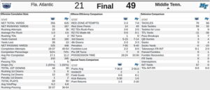 FAU football fell to Middle Tennessee (6-5, 3-4 C-USA) 49-21 on Saturday in Murfreesboro. The Blue Raiders posted 615 yards of offense, used special teams trickery, and forced a key turnover that cost the Owls