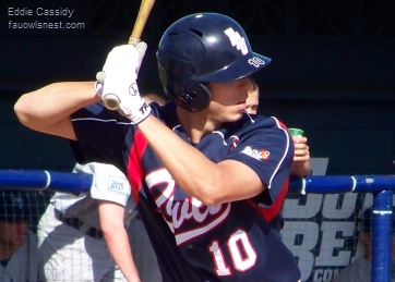 DH connects for three homers Eddie Cassidy is in FAUs lineup for one reason, to hit the ball out of the designated hitter spot, and he did just that today. Cassidy hit three homeruns against the Beavers, each of them against a different pitcher, and recorded his first three homerun game in his career. This is the first time Ive ever had three homeruns. Ive had a couple of games with two, and they felt good, but this feels great, Cassidy said of the three hits. Cassidys three homeruns and seven runs batted in, broke Florida Atlantic regional records, and fueled the Owls win over Oregon State, setting up a showdown with regional host, Florida. FAU pitcher Hugh Adams got the win, after pitching three and a third innings of work. Adams came in after the rain delay in the 3rd inning and struck out three batters, while giving up three hits and three earned runs. Starting pitcher R.J. Alvarez looked strong, until a third inning where he gave up four earned runs. Barry Rooks and Ryan Bernal came in to pitch after Adams, and only gave up a combined three hits. Raymond Church had a big day hitting out of the leadoff spot, going 2-5 with two RBIs and a double. However, the number two hitter, Mike Albaladejo was 0-5. Albaladejo has gone 1-14 in regional play. FAU now finds itself in a double header situation, something that they have seen before. The Owls played a Saturday double header against Western Kentucky and won the second game, 9-8. The other double header was against Louisiana-Monroe, and that second game was a 6-5 loss. Im always ready for a doubleheader, we might be a little tired, but our emotions will take over, Cassidy said about the team and the days second game. Head coach John McCormack on the second game starter, Taylor Everist, Hes good and got a lot of experience, he pitched really well in the conference tournament, so I think were in good shape. Discussion Box Score