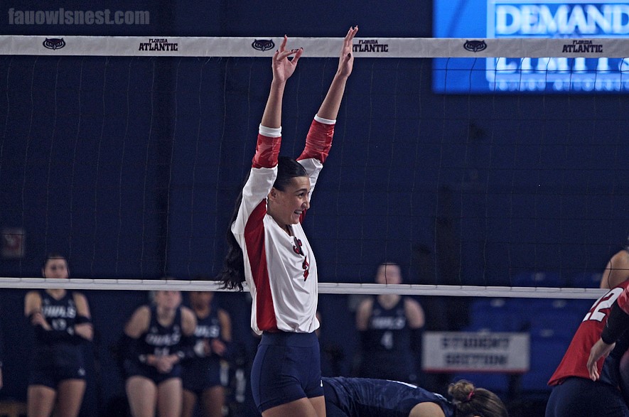 After a three-match losing streak FAU hosted Rice (11-6, 6-2 AAC) to Paradise. Rice came into the match in second place in the AAC trying to keep up with USF. Florida Atlantic rode the energy the Elly gave them to blank Rice 3-0 as an important weekend of conference play began. The first set had a quick pace to the action. At the media timeout it was FAU with a 15-11 lead. The 83.3 side out % kept the Rice attack from scoring in bunches up to that point. Florida Atlantic’s lead extended to five from a Victoria Hensley (pictured below, Angelina LaBelle) kill as Rice called a timeout; 18-13 in favor of FAU. Rice brought the set within two, but Florida Atlantic responded by pushing the gap to four; 21-17. Rice was not finished yet as RU brought the set within two once more, 22-20 in favor of FAU. After Rice evened the set at 23, FAU scored the final two points to secure the set 25-23. FAU, looking to end a three match losing streak, found themselves down one early, but a six-point scoring run capped off by a Madison Dyer (pictured below, Angelina LaBelle) kill turned the second set in favor of FAU early; 11-6. Rice sparked a three-point run of their own to draw the set within three, 13-10. FAU then went on a 7-3 run, with Katelynn Robine giving Florida Atlantic a 17-13 advantage. FAU extended their lead to seven reaching match point; 24-17. RU made the final point difficult to secure for Florida Atlantic as RU battled back to make the match a 24-21 deficit before a FAU timeout. Rice’s five-point run was not enough to overcome Florida Atlantic as FAU won the set 25-22. Rice, down 2-0, jumped out to a 4-0 lead before a Kaila Ru kill finished off a Florida Atlantic four-point run to even set three at four. Rice managed to gain their four point lead again causing FAU to call a timeout; 12-8. FAU’s flame was not yet extinguished as Florida Atlantic, with the help of a five-point run, earned their first lead of the set: 16-14 FAU. Rice evened the set at 17, but FAU kept pouring it on as they took a 20-17 advantage before a RU timeout. Florida Atlantic’s night of domination continued as FAU reached match point. After two Rice scores, FAU earned the final set 25-21, sweeping Rice 3-0. For whatever reason, Paradise is the place for FAU. The Owls are now 3-1 in conference play at the Elly and a victory over RPI’s 30th ranked Rice, comes to show the importance the home crowd brings for the Owls. Kaila Ru and Katelynn Robine both had themselves a night with both earning nine kills leading FAU to 38 in the match. Hensley had 32 assists as the Owls had a total of 36. Isabelle Northam’s role off the bench produced a team leading 12 digs, and four Owls tied with four blocks on the night. The celebration after the final point as the Owls gained the victory: ?️ #FAU WINS! @FAUVolleyball SWEEPS #2 #AAC #30 RPI #Rice in a HUGE UPSET! LET’S GOOO! ? ?? ? @Gbach2003 pic.twitter.com/3DO63RleC4 — FAU Owls Nest (@FAU_Owls_Nest) October 19, 2024 Closing out the weekend, the Owls (11-8, 3-4 AAC) will host the USF Bulls (11-7, 7-0 AAC) at the Elly. South Florida is currently the top team in the AAC, and the only team without a conference loss in the American. The Bulls are in a great spot coming into the contest as they currently sit 66 in the NCAA’s RPI standings. The match is the first of two this season between the two programs. Play starts on Sunday, Oct. 20, at 1 P.M.