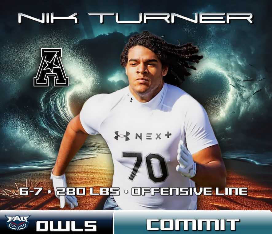 Size and strength are two things the Florida Atlantic football team will be getting when Nikolas Turner joins the Owls’ offensive line in 2025.