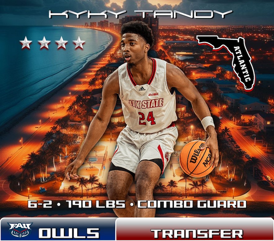Anticipate a lot of scoring from this offensive-minded guard who will join head coach John Jakus and the Florida Atlantic men’s basketball team for the 2024-25 campaign. That player is KyKy Tandy from Jacksonville State. KyKy Tandy Combo Guard 6-2, 190 lbs Transfer Jacksonville State Tandy announced his transfer to the Owls on Thursday morning, a day after visiting the campus. He leaves the Conference USA’s Jacksonville State Gamecocks after one season. He averaged 17.8 points, 2.6 rebounds, and 1.4 assists in 32 games, showcasing volume scoring on shooting splits of 41.9% from the field and 38.9% from beyond the arc. He also rarely misses at the charity stripe, making 107 of his 121 attempts. Tandy’s 2023-24 season featured a lot of scoring nights, including 10 20-point games and two 30-point displays. For the latter, the first happened against FIU when he scored a career-high 35 points on 12-18 shooting from the field and 7-12 from downtown. The second took place in the season-finale, seeing Tandy drop 32 points on 10-17 shooting overall and 6-9 from beyond the arc against Sam Houston. He used to play at Xavier, spending four years with the Musketeers. In 69 games, he averaged 4.9 points, 1.1 rebounds, and 0.9 assists. He didn’t average more than seven points per game for Xavier and saw his playing time dwindle as each year passed. His last two seasons saw him be riddled with injuries, fixing a stress fracture in his left leg during the 2021-22 campaign and seeing a foot injury sideline him near the end of the 2022-23 season. Tandy prepped at University Heights Academy for coach Grant Shouse, where he was a four-star prospect and named USA Today Kentucky Player of the Year and National Athletic Association of Private Schools (NAAPS) 3A National Player of the Year. He finished his career with 3,363 points, the eighth highest total in state history. He was also MVP of the Kentucky All A State Championship, averaging 22.8 points and 7.0 rebounds for the four-game title run by University Heights. As a highly rated four-star recruit with a score of 94 on 247Sports, Tandy emerged as the 12th-best combo guard in the Class of 2019, the second-best in the state of Kentucky, and the 82th-best in the country. He made the decision to commit to Xavier in October 2018 despite having enticing Power 5 offers from Ole Miss, Clemson, Auburn, Oklahoma State, Tennessee, and Florida among others. “Built like a tailback, is fast, explosive and powerful. A good shooter from deep, and should only get better with reps. When attacking the rim he uses his significant vertical explosion and strength to finish through taller players,” said 247Sports’ recruiting analyst Brandon Jenkins back in 2018, comparing Wright to former Arizona Wildcat Mark Lyons. “On the defensive end his toughness and athleticism give him significant potential, though he does need to have more of a commitment – especially off the ball. A solid prospect who can play both guard spots, but is more suited as a scorer who is a secondary ball handler and decision maker.” Having entered the portal on April 24th, Tandy had a 91 rating while ranking as the 20th-best combo guard in the nation and the 186th-best overall. Tandy’s ability to shoot the ball at a sheer volume will prove wonders for an FAU squad looking to have a dynamic offense with the heavily retooled roster they currently have at their disposal. His highlights from the 2023-24 campaign can be viewed below:
