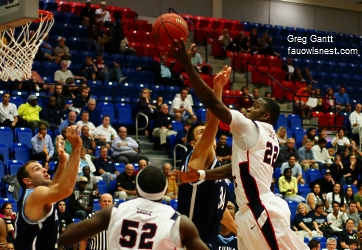 Owls shoot 2-of-25 from long range; White impressive despite loss Two coaching legends – Mike Jarvis and Rollie Massimino – met at FAU Arena tonight, but the elder came away the winner as Northwood slid past Florida Atlantic 85-81 in overtime exhibition action before an announced crowd of 1,032. Neither team played particularly good defense, with 53 personal fouls being whistled on the evening. But in the end, it comes down to making baskets. FAU struggled to find consistency in many facets in its first action of 2010-11, but most noticeable was a dismal 2-of-25 from long range performance. “The game was really lost from the net up, too many threes”, said Coach Mike Jarvis. “The guys that weren’t making threes, mainly Greg Gantt and Shavar Richardson kept shooting threes, and at some point in time you have to make adjustments.” The Seahawks, on the other hand, were 7-of-15, and that was a key difference. Northwood jumped out to a 15-6 first period lead before the Owls finally tied things up 36-36 at the break. Florida Atlantic started the second half with a spark as Gantt exploded for nine points to give the Owls their largest lead of the contest at 46-40. But the Seahawks weren’t done, as the lead would change hands three more times until Gantt forced overtime by making a lay-up to tie matters at 73-73 with just one second remaining in regular play. FAU had no answer for Northwood guard Jonathan Dunn, who poured in 42 points, eight of which came in overtime primarily from free throws. Gantt led FAU with 17 points, while Tucker and Royster each pitched in 16. Ray Taylor was held due to a violation of team rules, and that likely hurt as he was replaced by freshman Dennis Mavin, who managed just one point, one assist, and five turnovers in 20 minutes of action before fouling out. Newcomer Kore White posted a solid first outing with 13 points, a game high 14 rebounds, and three blocks. “When we face situations like we had today, we learn a lot of what not to do”, White said. “If we would have won, we would have thought that we did ok.” The team will get to show just what they learned from tonight soon enough. The Owls take on Lynn University in their second and final pre-season exhibition on Monday at 7:00.m. at FAU Arena. Game Discussion Box Score