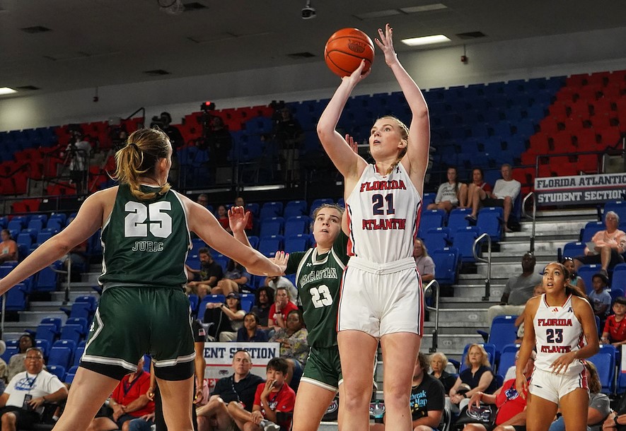 Florida Atlantic stretched their lead to 12 to begin the second half. A Manhattan tip-in followed by a Maria Myklebust (pictured top, FAU) three-pointer stood as the last five-points for the following 2:40 as at the media timeout FAU led 41-28. The final 3:57 remaining in the third saw a lot of action as the Jaspers and Owls traded multiple buckets closing out the half with the Owls lead cut to eight, 52-44.
