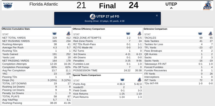 FAU Football vs UTEP Team Box Score 10-22-22
