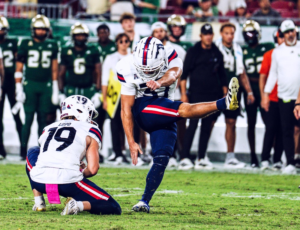 It looked easy for USF as on their opening drive they scored thanks to a Byrum Brown 22-yard scamper up the middle. The Owls responded with a nice drive of their own as the passing attack led FAU down to the Bulls 27. From there, it was the Bulls defense that stood up and held Florida Atlantic to a 45-yard Garrison Smith (pictured above, FAU Athletics) field goal, 7-3 USF.