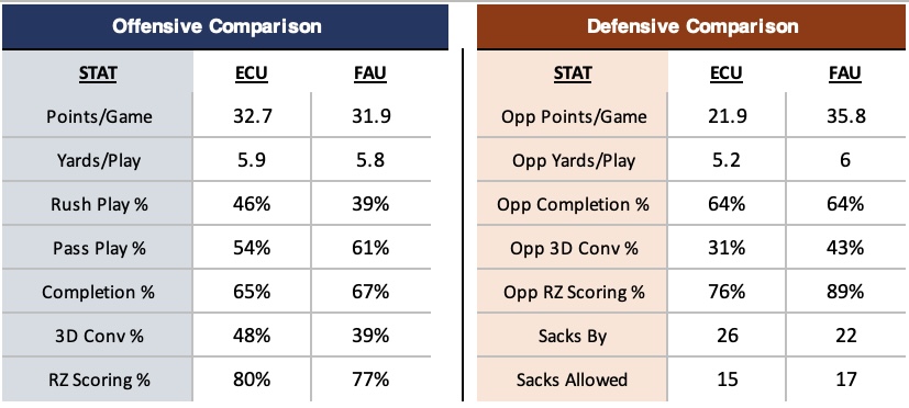 The Pirate defense is opportunistic up front, with 26 sacks and 85 tackles for loss while holding opponents to 3.8 yards per rush and 127.6 rushing yards per game. They’ve contained most ground games this season, and FAU’s inconsistent line could be vulnerable to constant disruption.