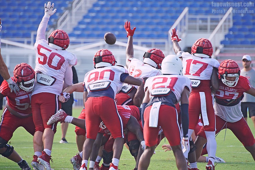 Florida Atlantic Football took the field at FAU stadium this morning for the first time during fall camp and displayed 80 plays in a controlled scrimmage format in front of friends and family during fan fest. Cam Fancher and Tyriq Starks led the two offenses for the majority of the game, with Kasen Weisman receiving snaps in the second half. Although the offense has looked much improved as camp has gone on, the defense won the scrimmage today, recording 4 interceptions and containing the offenses run game with a strong performance from the front 7. Owls coach Tom Herman said today’s defensive performance didnt surprise him considering they improved an already solid unit, and that the interceptions werent as concerning because of the high quality of defensive plays. I would have been surprised and disappointed had the defense not played like that, we played good enough defense in 7 out of 8 of our conference games, that a capable offense should have been able to win those games. Coming into this season, we feel like we have improved on that side of the ball, which I think is really good, when you improve from good. Offensively, nowhere to go but up, I think we were like 120th in the country in a multitude of categories so we are growing there, 2 of the interceptions I thought were unbelievable defense plays. I did not get concerned by the quarterbacks, FAU Coach Tom Herman said. QB Battle Update : Cam Fancher and Tyriq Starks have been in a battle for the QB1 position in the early portion of training camp, and today was the first time both were seen in live game action side by side. Fancher struggled a bit in the early portion, tossing an interception in his first drive of the game and had 3 interceptions total in the first half, however he settled in, and looked comfortable running the RPO side of the offense and was a serious threat with his legs, improvising multiple plays with his legs and gaining first downs. Starks was in much better control early on, leading 2 touchdown drives and a FG in his first 3 drives of the day, however running a less aggressive style of the offense, utilizing his running backs a bit more than Fancher did and sticking to short passes, which resulted in rushing touchdowns for Gemari Sands and Xavier Terrell. Although in this scrimmage it seemed like Starks won the day, FAU Coach Tom Herman says if the season started today, this scrimmage performance wouldnt deter his decision. “If we played Michigan State today Cam would start…I don’t know if that will change in three weeks. Tyriq has played well…and that possibility is certainly out there, FAU Coach Tom Herman. Defense wins the Day : In todays scrimmage, it was the defense that stole the show debuting their array of DB depth, limiting the offenses ability to stretch the field, staying in tight coverage despite the pre-snap motion the offense displays, while their front 7 provided a formidable pass rush and staunch run defense. Fancher tried to test the DB unit on the first drive of the day, and was met with one of the Owls new DBs on the outside as 6 ‘3 Buggs Brown intercepted a jump ball. A few drives later Des Tisdol intercepted a tipped ball off the line of scrimmage, and late in the first half DaeDae Hill snagged another one on the outside, capping off a dominant half for the defense in which they were shutting Fanchers passing game down and forcing him to run the offense with his legs. Although, both Starks and Fancher were able to gain multiple first downs with their legs, the defense kept them contained in the large scheme of things, executing a bend but dont break approach which resulted in a successful scrimmage for the defensive unit. FAU LB Des Tisdol (interception photo right above, Rick Henderson) believes that when the unit does what theyre capable off turnovers like today are just part of the game for the Owls. Everybody is just doing their job and the ball just falls into their hands, working together and getting 4 takeaways is just fun, Tisdol said. Depth at WR & RB : The talk around the depth that this FAU squad has, specifically at skill positions, has been rampant this offseason, as the Owls have brought in numerous WRs and have a room full of RBs who are capable of receiving in-game carries. That depth was on full display today, as Gemari Sands and Xavier Terrell scored TDs on the first team defense, both showing strong ability to muscle for yards and move downfield with a brisk pace, while the two backs ahead of them on the depth-chart CJ Campbell and Zu Mobley also looked solid, helping move the chains with inside zone carries and both as solid options in the pass game. OL Alex Atcavage mentioned that the depth in the RB room has been the talk of the team this offseason, and that it has a chance to make the offense much better. We talk about it all the time, our running back room, they make us right. They hit those holes, Coach Perkins does a great job with them, we are comfortable with whatever back is in there because we know that they know what to do and were all on the same page and I feel like thats what we have been lacking in years past, we are really close with the backfield and I think that its going to be a really fun year, Atcavage said. In terms of the WR-room, the same qualities rung true as the Owls have had multiple receivers make an impact in this scrimmage and throughout the spring. Bringing in a multitude of different receivers with different skill sets was the approach that the Owls used, and one of those receivers who FAU brought in, EJ Horton (photo below, Rick Henderson), recorded a 50 yard reception in the scrimmage and believes he has a capability to impact the game in a variety of ways. I feel like I can stretch the field, but I feel like I can really do it all, multiple guys in the room can take the top off the defense, Horton said. EJ spent time with Qb Cam Fancher 2 years ago when the duo was at Marshall together, and although there wasnt much of
