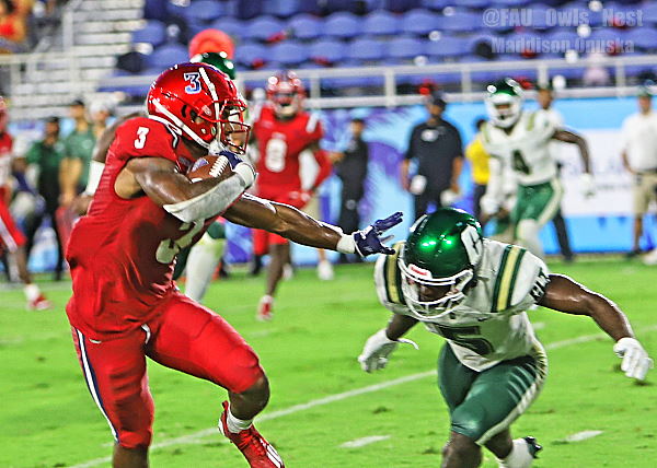 The Florida Atlantic University football team cruised to a 43-13 win over Charlotte to open the 2022 season at home on Saturday night. Charlotte opened the scoring on the first drive of the game. A 52-yard pass from Chris Reynolds to Grant DuBose briefly quieted a raucous FAU Stadium crowd. The Owls offense didn’t take long to respond though. On the ensuing drive, Larry McCammon III broke off a 52-yard run and hit paydirt to tie it at 7-7. After two Morgan Suarez field goals and a two-yard N’Kosi Perry touchdown run, the Owls were in control. It was the defense, however, that struck for the game-changing play just before halftime. As 49ers quarterback James Foster was forced from the pocket, his intended pass to his tight end was too high. It bounced off the receiver’s fingertips and into the hands of a waiting Justin McKithen. The sophomore returned the interception 63 yards to the house. With 17 seconds left before halftime, the Owls had a commanding 26-7 lead. A 30-yard touchdown pass from Perry to Je’Quan Burton on the first drive of the third quarter further cemented the Owls grip. Zuberi Mobley would later punch in a one-yard run to put the Owls up over 40 points for the night. Suarez tacked on two more second half field goals. “I’m proud of our football team and the way we went out and performed today. I was proud of how we went out and took care of business in all three phases”, said Head Coach Willie Taggart. “I’m really pleased with our guys and how we responded after the first touchdown that Charlotte scored. That’s something that we’ve talked about all training camp, how to deal with adversity and when things don’t go our way. We haven’t been good with that in the past, so that is something that we needed to overcome.” Notables Perry finished 16-of-22 for 256 yards, a passing score, and a rushing score McCammon (photo) racked up a new career-high 118 rushing yards and added 16 receiving yards on two catches LaJohntay Wester led the receiving corps with four catches for 66 yards Eight different players caught at least one pass for the Owls Eddie Williams paced the defense with eight tackles (three solo) Evan Anderson, Jalen Joyner, Jayden Williams, and Jaleel McRae registered one sack each Suarez finished 3-for-3 on field goals (43, 19, 42 yards) Punter Riley Thompson was only needed three times but totaled 140 yards, including a long of 54 yards The Owls will hit the road to Athens, Ohio next Saturday for a meeting with Ohio University. They return home September 10 when Southeastern Louisiana comes to town.